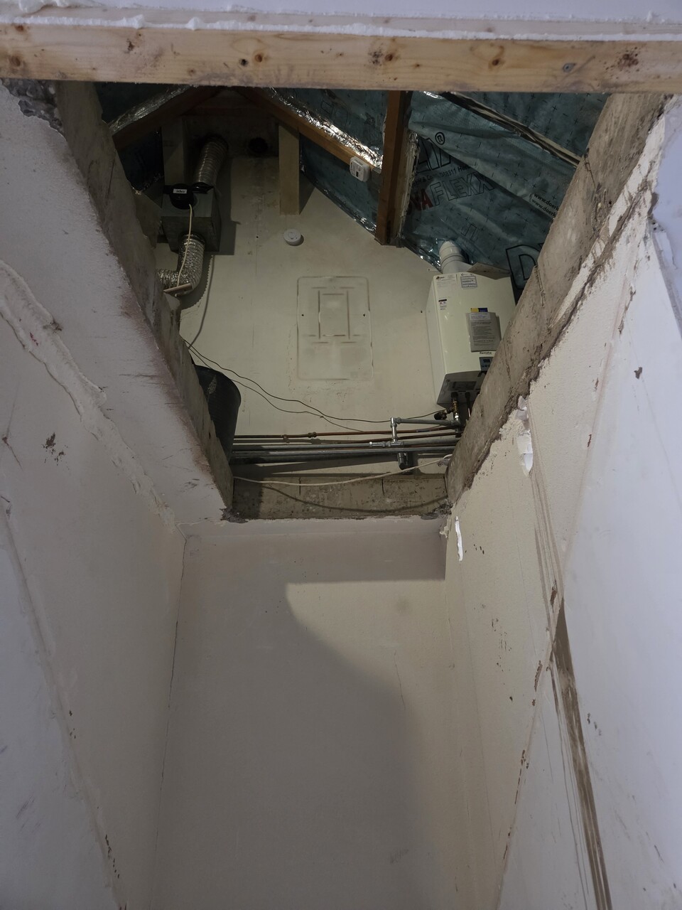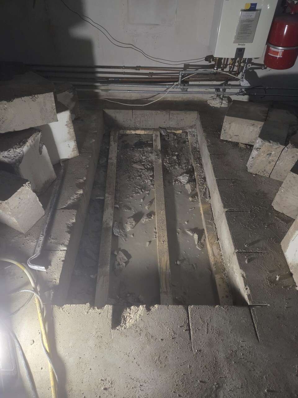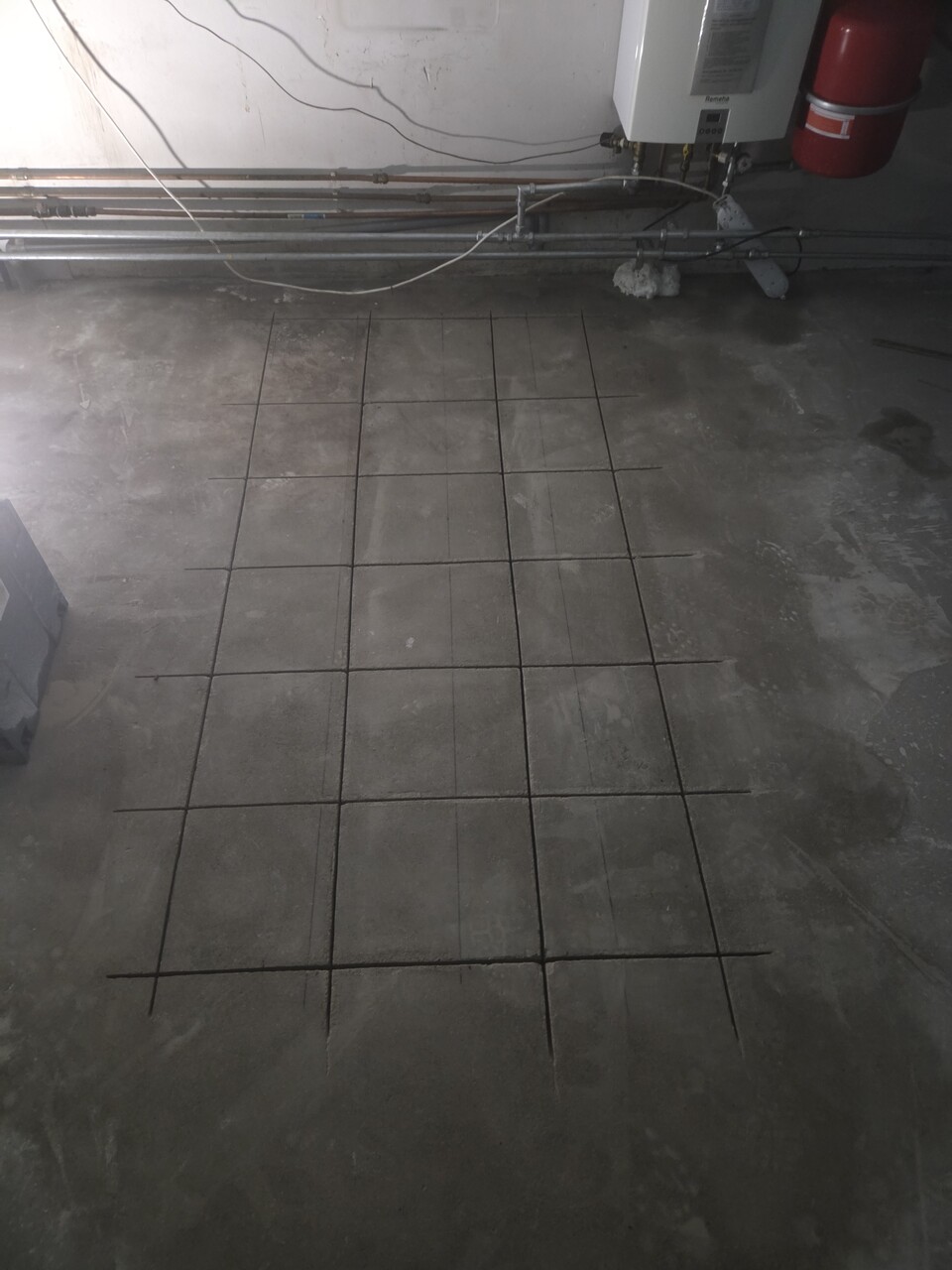 Voordat we aan de slag gaan met de machines, maken we een opvangbak onder het beton van het te zagen trapgat. Hierin worden zowel de uitgezaagde resten als het water dat vrijkomt tijdelijk opgevangen. Zo blijft de benedenruimte beschermd en schoon, waardoor we overlast kunnen minimaliseren. Ook tekenen we het gat eerst uit op de vloer. Hierdoor weten we zeker dat we accuraat te werk gaan.